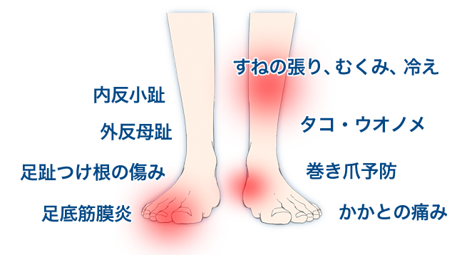 処置時間も聞きたい事や手早くわからない所にもきちんと教えて下さる所にもとても満足しております。また施術により、外反母趾の改善だけでなく、頭痛や肩こりも良くなってきています。体の不調の原因は足(歩き方)なんだなあ、とつくづく感じています。(M.Y(53))