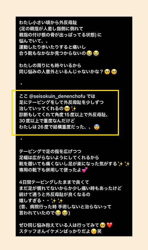 外反母趾があると革靴をはいただけで痛みを感じるだけでなく、腰痛や肩こり又は年配になってから転倒しやすくなると聞き、改善させたいと思っていた所にこちらの整足院を見つけ通う事にしました。