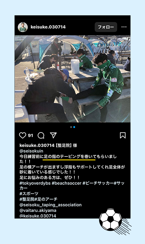 左足小指の痛み改善とビーチサッカーのプレーの質向上の為に通っています。日常生活だけでなくプレー中も足指を上手く使えている感覚です。