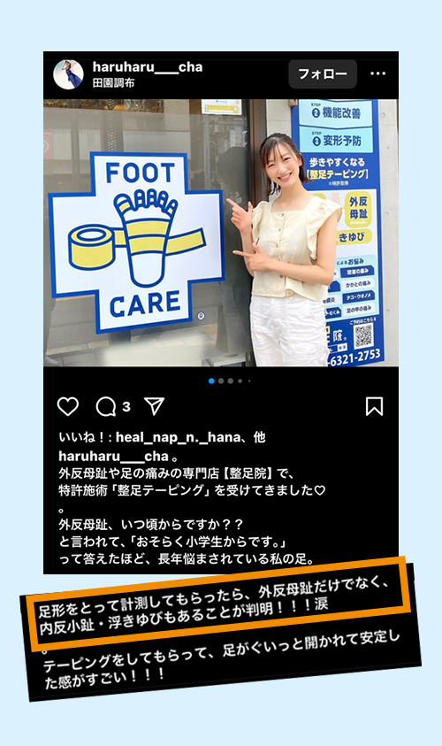 「こちらの説明を聞いたときはまさに目からウロコでした。手術やインソール以外のアプローチとして、整足テーピングをオススメいたします!」